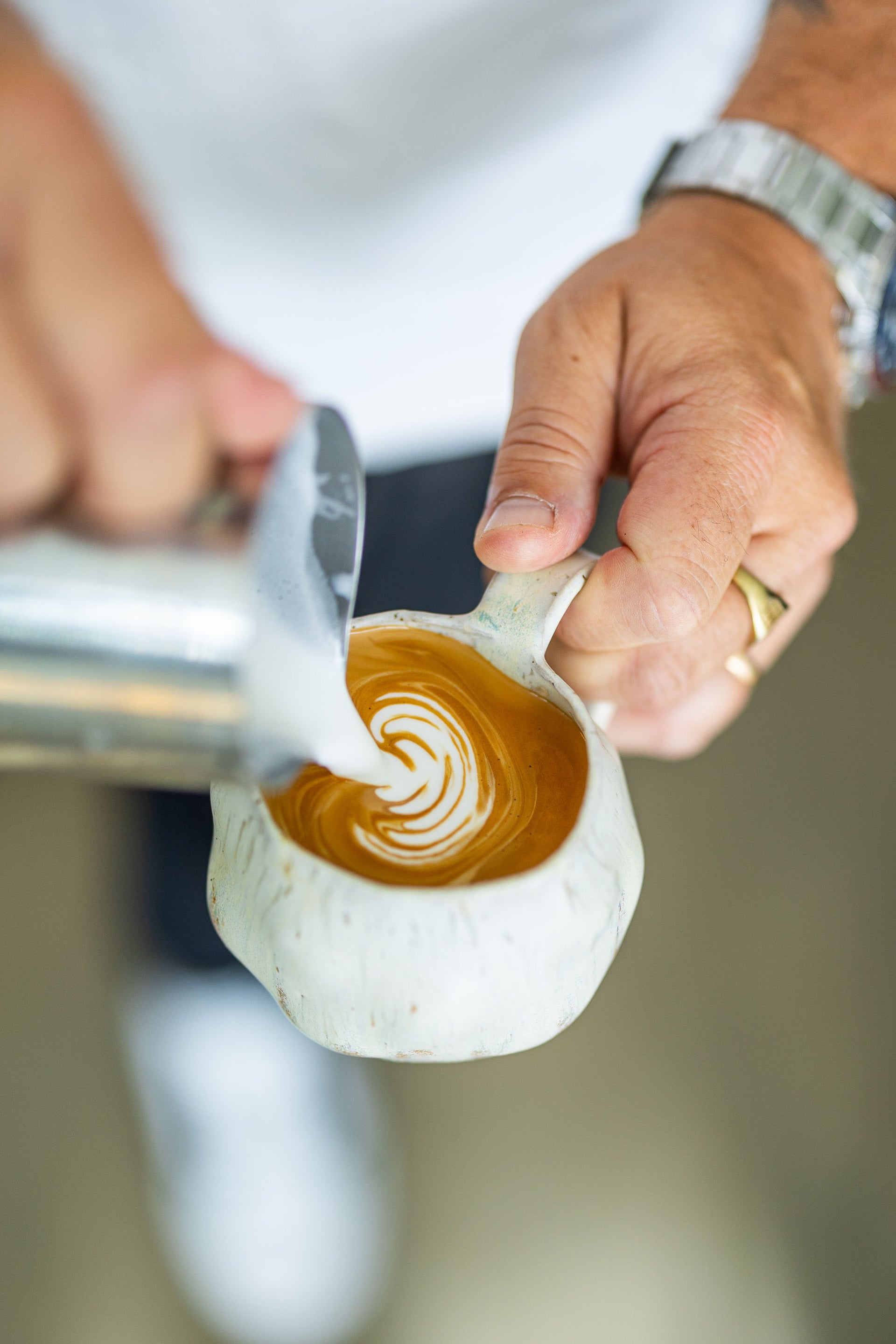 Start højt: Hæld kontinuerligt og langsomt mælkeskummet i midten af din kop. Kom tættere på koppen med kanden, når koppen er halvt fuld for at begynde at tegne dit mønster.