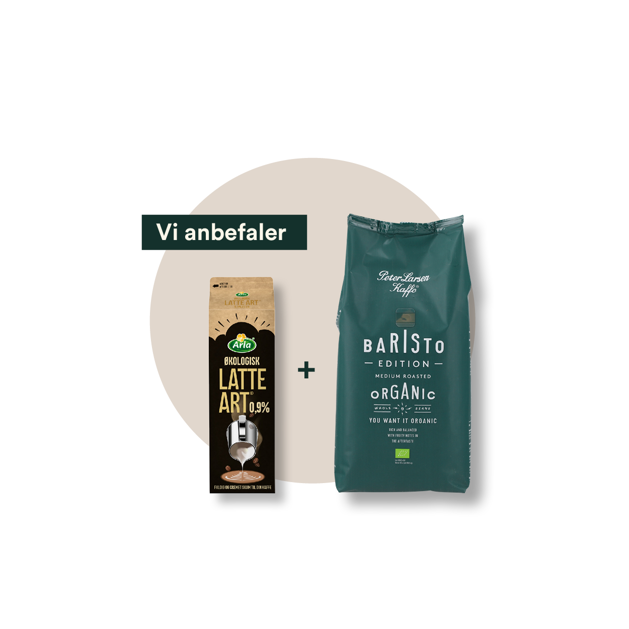 1 dobbelt espresso på Peter Larsen Kaffe Baristo Edition Organic 2 dl Arla Økologisk Latte Art 0,9% Mælkeskum til pynt